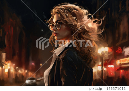 Portrait of a beautiful fashionable woman with a hairstyle, in a city street, at night.