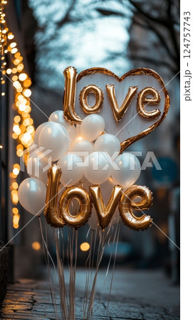 Gold Love Balloons Surrounded by White Balloons at a Festive Evening Street Event