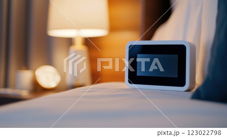 A modern digital alarm clock on a nightstand displaying a 'Spring Forward' reminder for Daylight Saving Time.