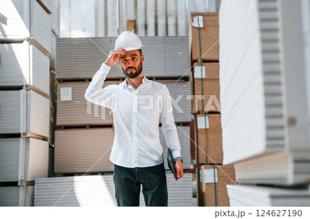 In formal clothes. Storage worker is in the warehouse with bunch of products