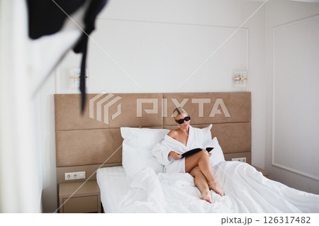 Seductive young bride posing on the bed in hotel room wrapped in white blanket
