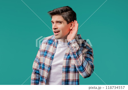 Curious 30s handsome man doesn't hear,asking what.Quiet sound,deaf,misunderstand