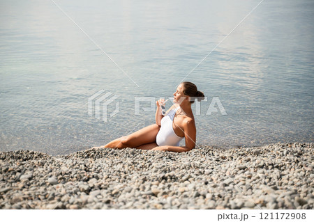 エレガントな白いスーツ姿の上品な女性の微笑み