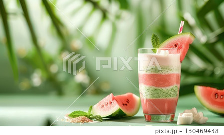 Refreshing watermelon smoothie in a glass with fresh fruit slices on a green background.