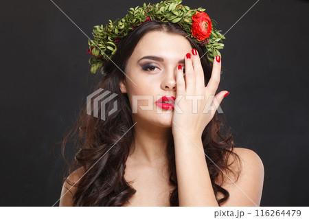 Nice young woman with floral head wreath looking at camera while standing against black background