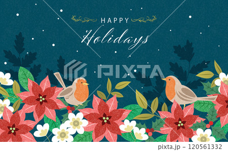手描きでかわいいポインセチアと鳥のクリスマス用ベクターフレームデザイン・ホリデーカードテンプレート