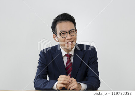 カメラ目線で顔をしかめるイヤホンをつけたアラフォーのビジネスマン
