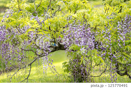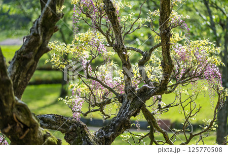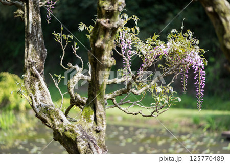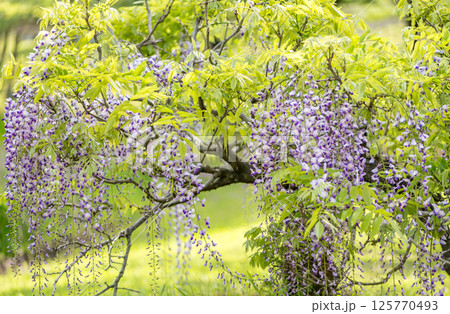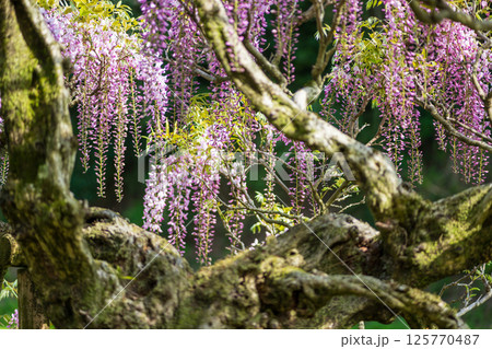 雨の古代の森に咲き乱れる春の花藤の絶景