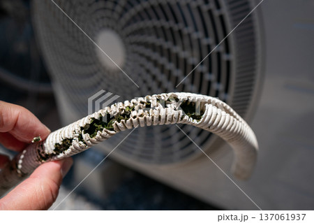 エアコン室外機の排水ホースが破損して中に藻が発生していた