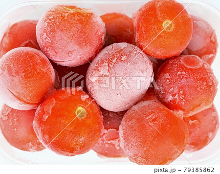 冷凍ミニトマト、冷凍野菜 ミニトマト、マクロ撮影、白背景