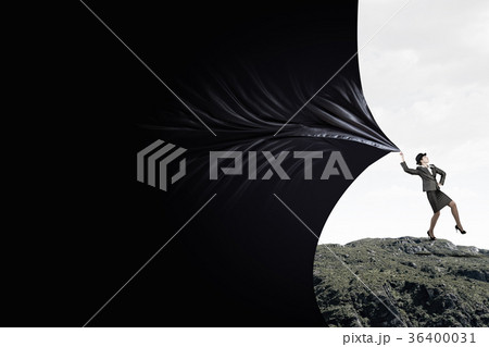 Woman pulling clothing banner