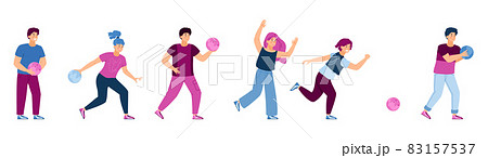 Set of people making bowling throw, flat cartoon vector illustration isolated.
