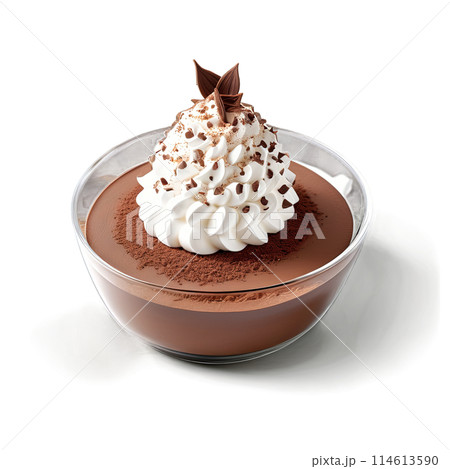 A mouthwatering and indulgent chocolate mousse in a round, clear glass dish, topped with whipped cream an