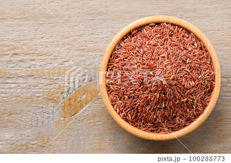 Brown rice on wooden table, top view. Space for text