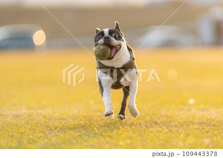 公園で遊ぶ愛犬 ボストンテリアとカニンヘンダックス