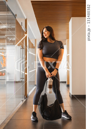 Plus size woman in gym outfit with shake bottle and bag, standing in hallway, wellness style