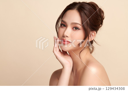 A beautiful young Asian woman with clean, fresh skin against a beige background. Skincare, facial treatment, cosmetology, beauty, and spa. An elegant portrait of an Asian woman.