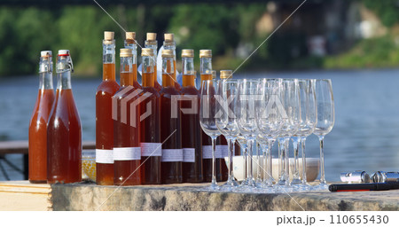 Fresh fruit cider and glasses at stall at farmers market