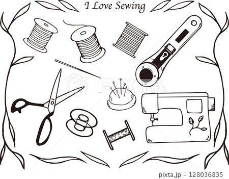 手芸、刺繍、裁縫の手書きイラスト(編み物、ボタン、糸、まち針、ハサミ、ミシン、ハンドメイド、毛糸)