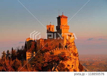 イタリアに囲まれたサンマリノ共和国の世界遺産ティターノ山 朝陽を受けて輝くロッカグアイタ城砦