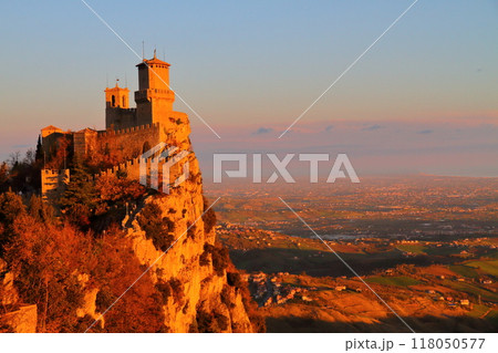 イタリアに囲まれたサンマリノ共和国 世界遺産ティターノ山断崖の夜明けのロッカグアイタ城砦の景色