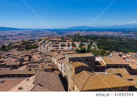 A view of Volterra, Tuscany, from the cathedral tower, overlooking the surrounding rooftops and countryside. Italy