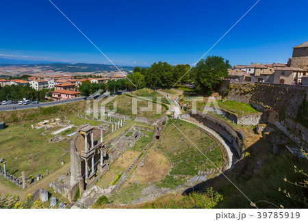 Roman Theatre Ruins with Columns in Volterra, Italy, during a Sunny Day