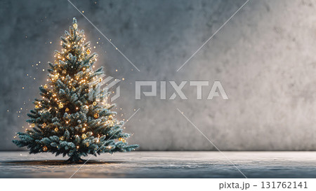 A realistic photo of a glowing Christmas tree with decorations, minimalist and Clean background