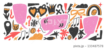 Crayon funky doodles collage cutouts set for playful design. Speech bubbles with music note, crown, hearts for fun messages. Callouts text boxes inverted Spanish punctuation mark. Vector scribbles