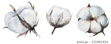 Handpainted watercolor dried cotton flowers, Bohemian wedding isolated illustration element