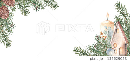 Christmas Advent banner with Winter plants, fir, pine branches and cones, candle and ceramic house, lantern. Watercolor horizontal frame, border. Hand drawn illustration. Perfect as a web banner, card