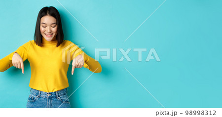 Shopping concept. Beautiful asian girl in yellow sweater smiling, pointing fingers down with satisfied face, showing cool advertisement, blue background