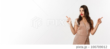 Luxury woman with red lips, wearing elegant evening dress, pointing fingers sideways and looking left at logo, showing christmas advertisement, stading over white background