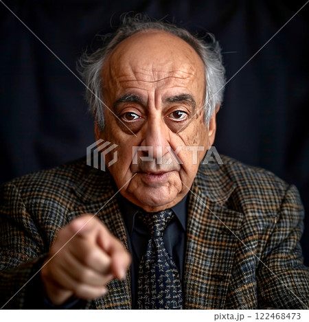 An elderly man with a stern expression points directly at the viewer, dressed in a patterned suit and tie. The background is dark, emphasizing his facial features and intense gaze.