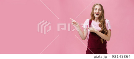 Excited pretty lady in dress say wow, looking intrigued by advertisement, pointing fingers up at logo, standing against blue background