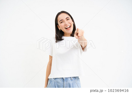 Enthusiastic asian woman, points finger at camera, congratulating, peeking you, inviting people, isolated on white background