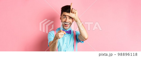 Image of funny guy pointing at you camera and showing loser sign, mocking person who lose, standing over pink background
