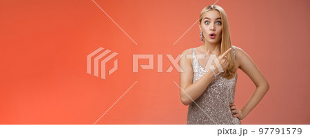 Wondered amused attractive blond woman talking party widen eyes say wow pointing questioned right direction see famous person standing surprised impressed gaze camera, red background