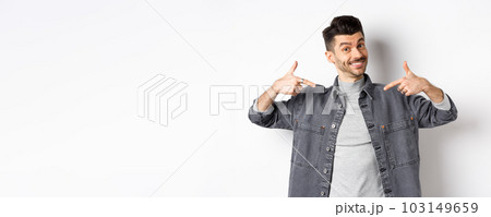 Confused and surprised young man pointing at himself, being chosen or accused, standing on white background
