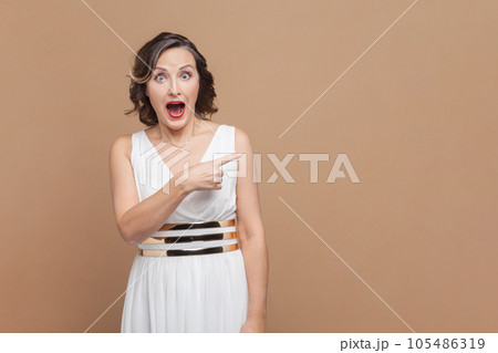 Portrait of happy joyful middle aged woman with wavy hair pointing away at copy space for advertisement, wearing white dress. Indoor studio shot isolated on light brown background.