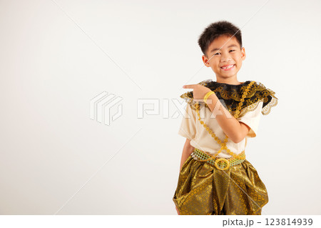 Portrait Thailand kid boy smiling traditional Thai dress costume indicate finger empty space, studio isolated white background, primary child pointing index out with copy space