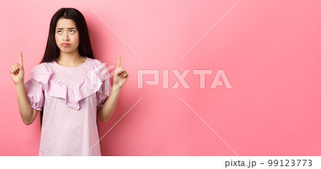 Sad pitiful asian girl sulking, pointing and looking up with disappointed face, feeling upset, standing against pink background
