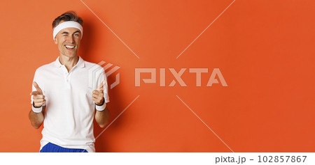 Concept of sport, fitness and lifestyle. Portrait of confident, handsome middle-aged man in workout uniform, pointing fingers at camera and smiling, inviting to gym, standing over orange background