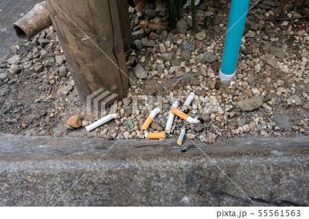 公園に捨てられているたばこの吸い殻 落ち葉と白い煙草のポイ捨ての素材写真