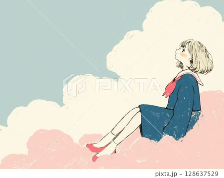 草原で読書する少女のイラスト ― 青空とそよ風に包まれた、穏やかな午後のひととき