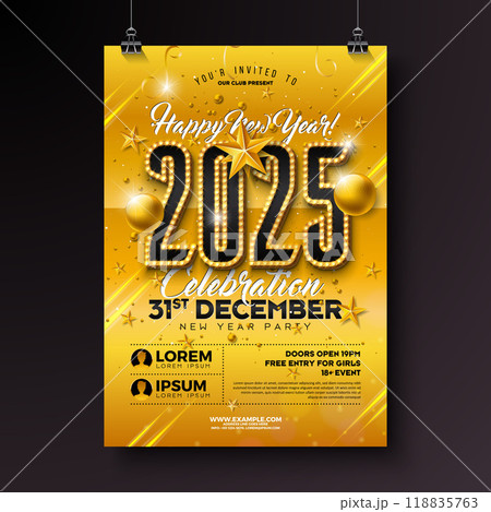 Happy New Year 2025 Party Celebration Poster Template Illustration with Glowing Light Bulb Billboard Number on Yellow Background. Vector New Year Eve Holiday Design. Premium Invitation Flyer or Promo