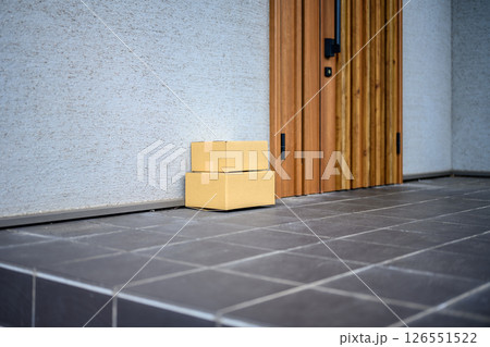 postman mail carrier carry two paper post boxes deliver to customer in front of door at home. Express delivery service, online shopping and logistics concept.