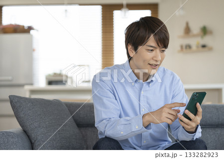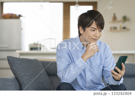 自宅のリビングでスマートフォンを操作する30代の男性