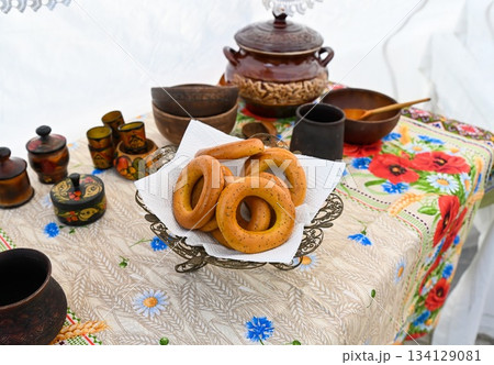 Slavic table with bagels, clay pots, and wooden utensils on a floral cloth. Traditional Russian folk style and rural handmade culture.