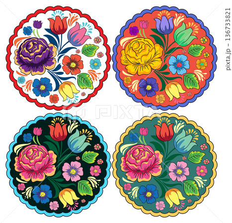 Colorful Floral Folk Art Round Vector Set